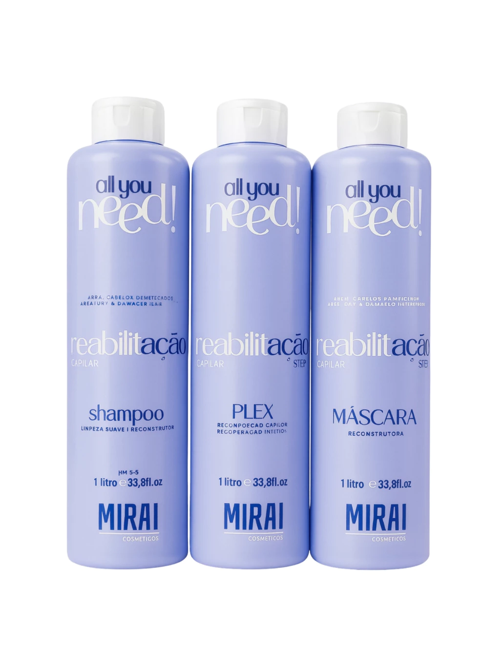 O Kit Reabilitação Capilar All You Need! da Mirai Cosméticos é o tratamento completo para cabelos danificados, elásticos, quebradiços ou porosos, oferecendo uma reconstrução intensiva e imediata da fibra capilar.