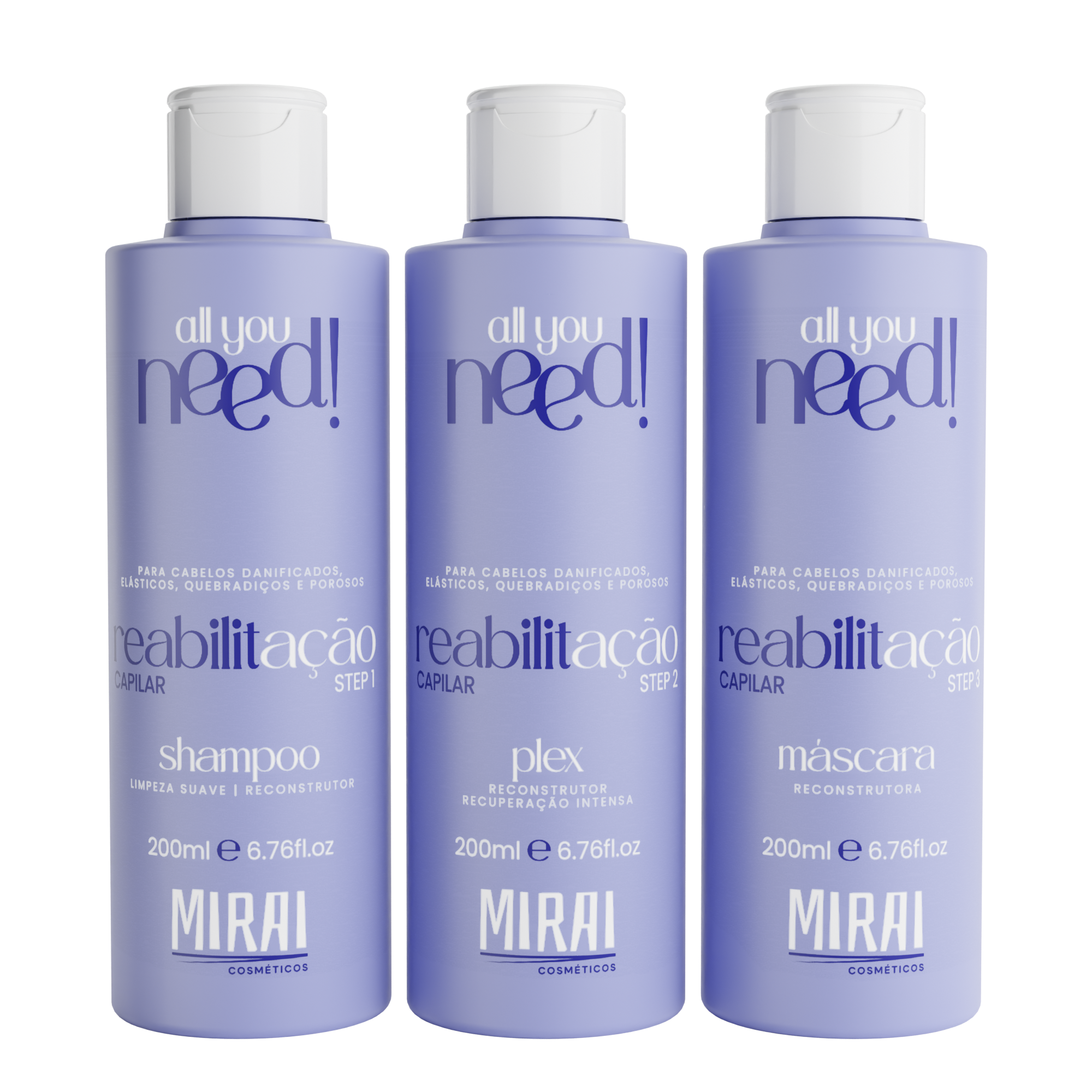 O Kit Reabilitação Capilar All You Need! da Mirai Cosméticos é o tratamento completo para cabelos danificados, elásticos, quebradiços ou porosos, oferecendo uma reconstrução intensiva e imediata da fibra capilar.